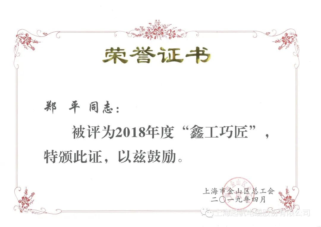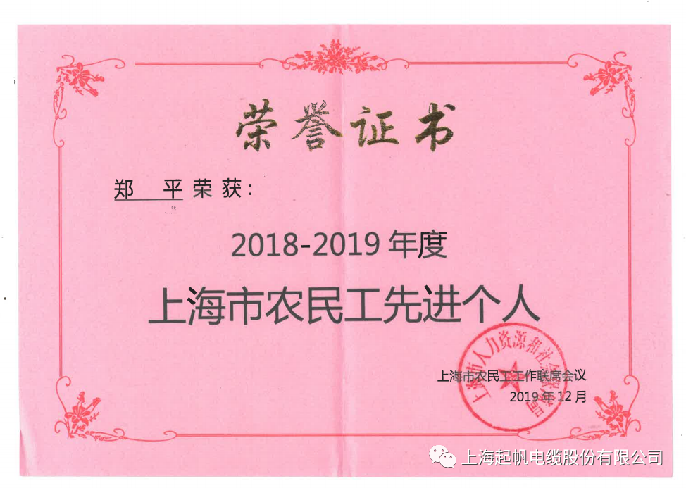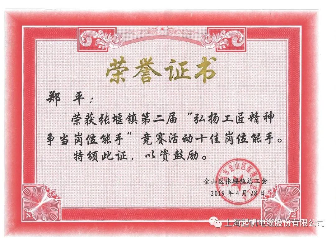 上海起帆电缆股份有限公司动力设备科科长郑平同志荣登榜单。